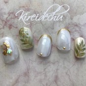 ホワイトベースに手描きのボタニカルアートやシェル、箔をのせた涼しげな印象のネイルです!