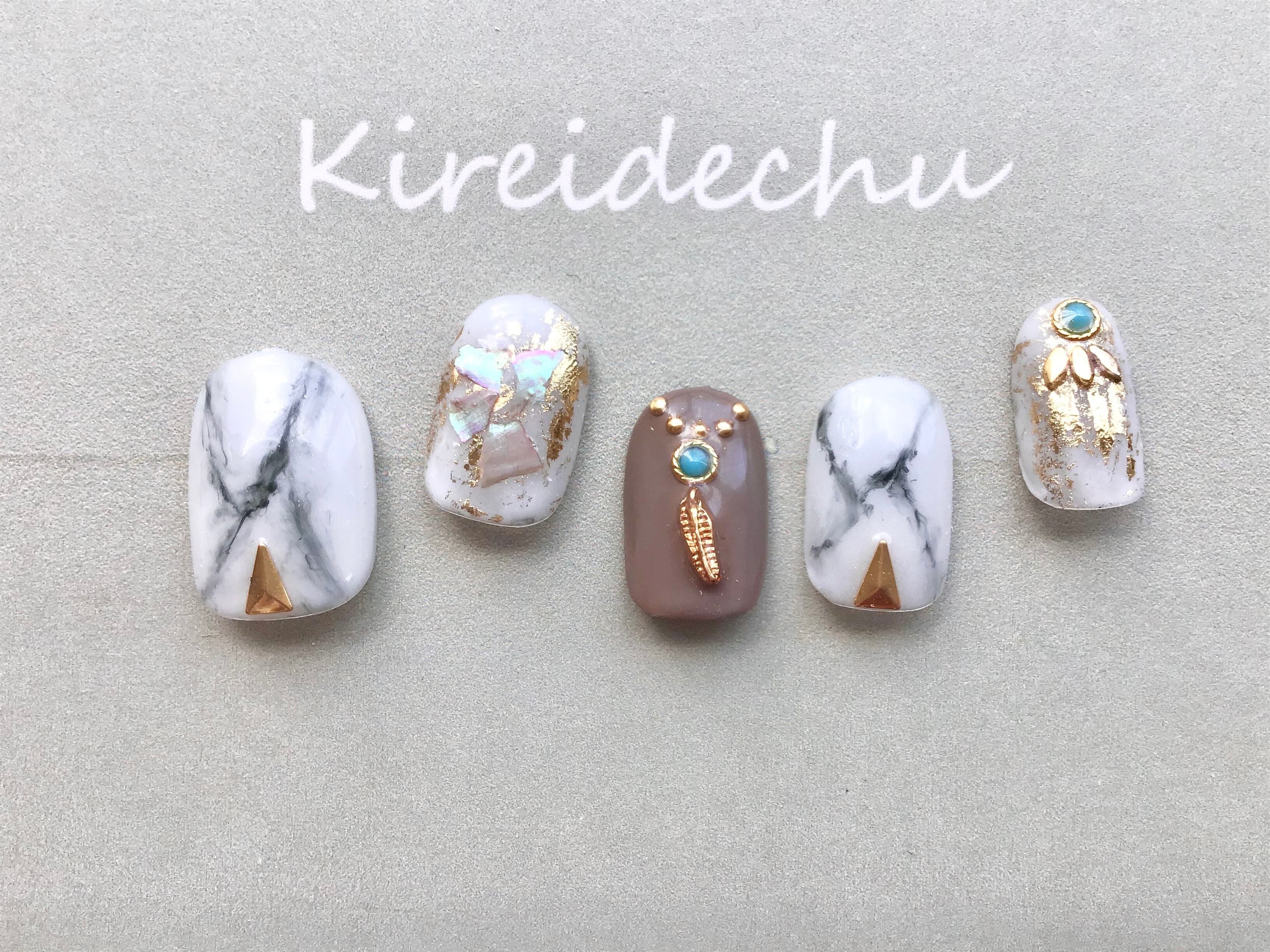 人気の大理石ネイルに羽のモチーフやターコイズのストーン、箔などを使いカッコいい印象のネイルに⭐︎