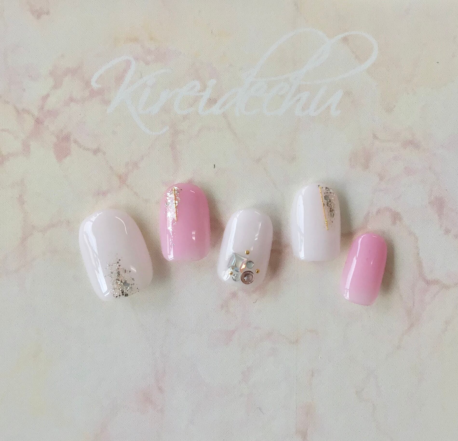 ピンクがかったホワイトベースとライトピンクのベースにストーンやラメを乗せた可愛いブライダルネイル♡