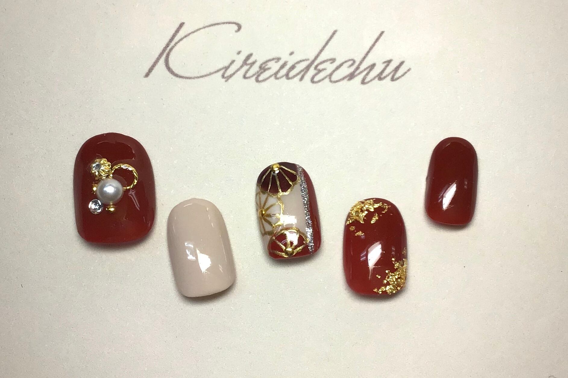 ボルドーにゴールドの箔などを使ったオシャレな和装ネイル
